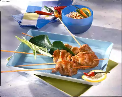 Wash the fillet and cut into thin strips of about 10 cm. Put them on the tips of skewers in a wave-like pattern. Peel ginger and garlic and chop very finely. Mix with lemon juice and sesame oil. Spread the marinade on the saté skewers and let them stand for about 30 minutes. Then deep-fry in hot oil for 2-3 minutes. Peanut sauce tastes good with it