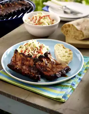 Lift the meat out of the water, drain and place in the marinade. Leave to marinate for approx. 15 minutes. Put the meat on the hot grill and grill it for approx. 10 minutes on each side until crispy brown, placing the lid, if present, on top. Arrange ribs with coleslaw on plates. Serve with ciabatta or baguette bread