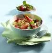 Beat the egg white until stiff, fold into the semolina. Wash, clean and halve the strawberries. Mix strawberries, orange juice, vanilla pulp and a few drops of sweetener. Wash lemon balm, pluck leaves from the stalk, cut into strips and add to the strawberries.