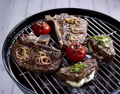 Cut the shallot into rings. Mix with Tabasco, green pepper and 5 tablespoons olive oil. Dab steaks dry and leave them in the marinade for 1-2 hours. Remove steaks from the marinade and season with salt. Grill for 5-7 minutes while turning. Grill tomatoes for 3-4 minutes while turning.