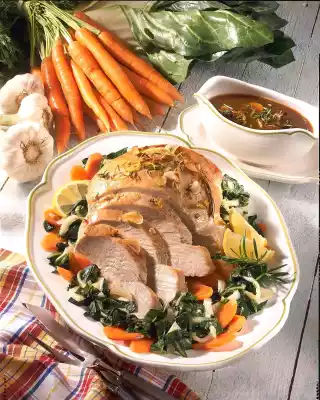 Pour hot chicken soup over the turkey breast several times. After approx. 30 minutes of cooking time, pour the marinade with garlic and herbs over the turkey breast and finish frying. In the meantime clean, wash and drain the carrots and chard.