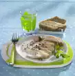 Bring the stock to the boil, stir in the sauce thickener and bring to the boil again briefly. Season sauce with salt, pepper and possibly some sugar. Cut meat into slices and arrange on a plate with the vegetables.