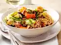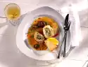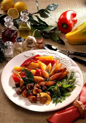 Then mushrooms, bay leaf and lemon slices 5 minutes. Then cook the peppers for 1 minute and finally sugar snap peas and garlic for 5 minutes. Arrange the vegetables on a plate and garnish with rosemary and thyme leaves.