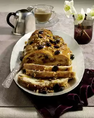 Let it cool down lukewarm. Spread 50 g sugar, vanillin sugar, salt and flavour on the rim of the bowl. Knead with the dough hooks of the hand mixer to a smooth dough. Cover and leave to rise in a warm place for 1 hour. Chop 75 g mocha beans. Knead sultanas, 100 g chopped almonds and mocha beans into the dough. Halve the dough. Roll out to a rectangle (approx. 27 x 30 cm) on a floured work surface. Stir 250 g jam until smooth. Spread each half on a rectangle of dough. Fold over approx. 1 cm on each side. From the long side, fold over approx. 1/3 to the middle. Fold over the other long side and form into stollen with the edge of your hand. Place the stollen on a baking tray lined with baking paper. Cover and let rest for another 15 minutes. Bake in a preheated oven (electric cooker: 200 °C/ convection oven: 175 °C/ gas. Level 3) for approx. 10 minutes. Then turn down the temperature (electric oven: 175 °C/ convection oven: 150 °C/ gas: stage 2) and bake the stollen for another 25-35 minutes.