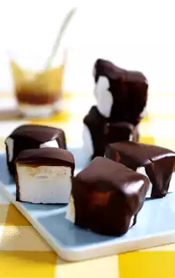 Put the mixture in a cool place for at least 1 hour. Chop the chocolate and dissolve over a warm water bath. Remove the marshmallow mixture from the mould and cut into squares (approx. 4 x 4 cm). Spread 1 tsp. caramel spread on each square. Cover with chocolate. Put in a cool place
