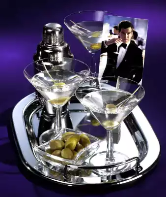Put the olive on a wooden skewer and place it in the glass. Shake gin and vermouth with crushed ice in a cocktail shaker. Strain the cocktail through a sieve into the glass and the ##James Bond## cocktail is ready.