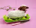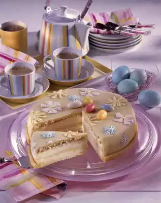Whip the whipped cream until stiff. When the yoghurt cream begins to gel, fold in the cream. Spread half of the cream on the cake base, place a second base on top and sprinkle with orange juice. Add the rest of the cream and finish with the last cake base. Chill the cake for about 3 hours. Remove the cake from the ring and put it back in the fridge. Knead marzipan and 100 g icing sugar. Roll out to a circle (34 cm Ø) on cling film. Spread the cake with apricot jam and place the marzipan lid on top. Press on firmly. Cut off excess marzipan and colour with some red food colouring. Roll to a roll of about 80 cm and place around the bottom of the cake, press down firmly. Stir the remaining icing sugar with 1 tablespoon of water until smooth and divide into three parts. Colour each of them red, blue and yellow and put them into small piping bags. Grind small flowers on the cake as desired and decorate with sugar Easter eggs. Results in about 12 pieces