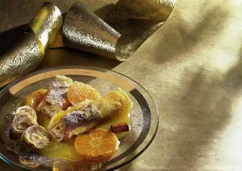 Stir in sauce powder, bring to the boil again and add liqueur. Carefully fold slices of mandarin orange into the sauce. Heat the fat in a frying pan and bake 4 thin crépes from the dough, one after the other. Spread a thin layer of marzipan mixture on the crépes, roll them up, cut them in half and slice them as desired. Arrange mandarin orange sauce and one crépe each on four plates. Serve dusted with icing sugar and cinnamon