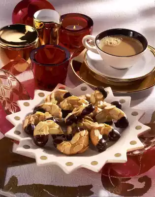 Carefully sprinkle with almonds and press down lightly. Bake the croissants one after the other in a preheated oven (electric: 175 °C/ gas: level 2) for 10-12 minutes. Remove from the oven and allow to cool on a rack. In the meantime, roughly chop the chocolate coating and melt in a hot water bath. Dip both ends of the croissants into the couverture and leave to dry on a grid