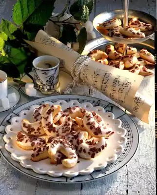 Let the croissants cool down. For the icing, mix rum, 2 tablespoons of water and remaining icing sugar to a thick icing. Spread the icing on the croissants and sprinkle with chocolate flakes. Leave to dry.