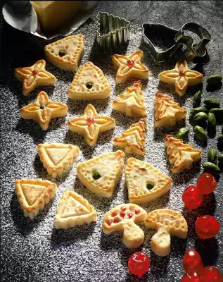 Knead marzipan paste, sieved icing sugar and rose water. Roll out between 2 layers of foil about 7 mm thick. Turn cookie cutters in icing sugar and cut out shapes as desired.