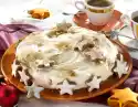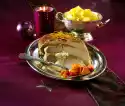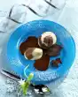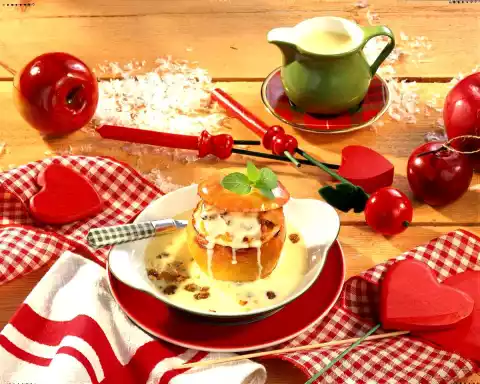 Now switch off the oven. Take out the baked apples with the help of potholders. Spread the vanilla sauce over them and sprinkle the baked apples with a few raisins and almonds as desired. Place the apple lids on top, decorate them with mint leaves if desired and serve everything immediately