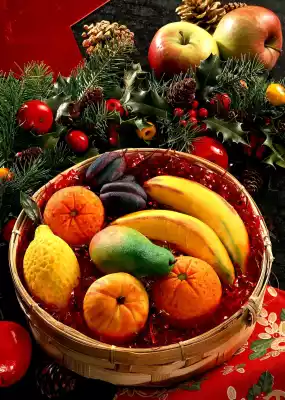 Knead marzipan and icing sugar. Form 2 bananas, 2 oranges, 1 lemon, 1 apple, 1 pear, and 3 plums from the mixture. For the stalk and flowers put cloves into the marzipan. Press the orange pistachio pieces into the marzipan as flowers.