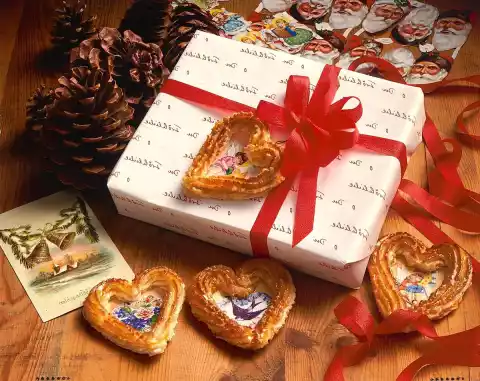 Cut off the protruding edge of the baking wafers. Dissolve remaining jam at low heat and spread on the marzipan hearts. Stick a glossy picture in the middle of the hearts. Use a wooden skewer to pierce a hole in the marzipan to hang it up and let the hearts cool down completely.