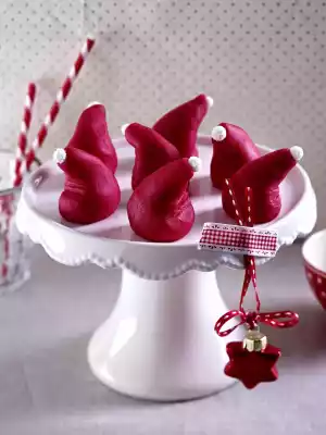Knead marzipan with icing sugar and red food colouring. Divide the marzipan into approx. 15 equally sized pieces. Form caps from the marzipan. Form each piece of marzipan into a cone.