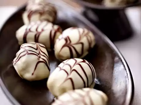Dip marzipan plums one after the other with a fork into the white chocolate coating. Drain well and place on baking paper. Pour the dark chocolate coating into a piping bag. As long as the white couverture is still moist, draw lines across the pralines. Draw through with a wooden stick. Allow to dry