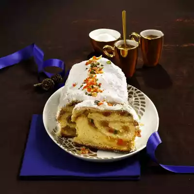 Grate marzipan finely and knead with 100 g icing sugar. Cut marzipan into small cubes. Roll out the dough into a rectangle (50 x 40 cm) on a lightly floured work surface. Spread marzipan cubes and pistachio-fruit mixture evenly on the rectangle, except for 2 tablespoons for decorating. Leave a small margin free. Roll over 1/3 of the dough from one long side. Roll the other long side inwards and form into a stollen with the back of your hand floured. Turn over the ends of the dough. Place the Stollen diagonally on a baking tray lined with baking paper. Bake in a preheated oven (electric range: 175 °C/ convection oven: 150 °C/ gas: level 2) for approx. 55 minutes. If necessary, cover with parchment paper for the last 10 minutes. Remove the stollen from the baking tray and allow to cool slightly on a cake rack.