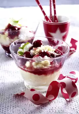 Fill semolina flummery and cherries into glasses. Serve sprinkled with remaining marzipan.
