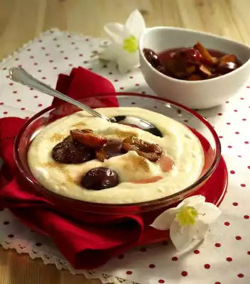 In the meantime, separate the egg. Beat the egg white with salt until stiff, sprinkle in sugar. Whisk the egg yolks, mix with 2 tablespoons of semolina porridge, stir into the semolina porridge. Fold in the beaten egg white. Serve the semolina with plums, sprinkle with cinnamon and sugar