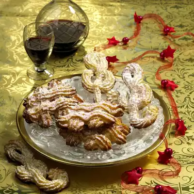 Line 2 baking trays with baking paper. Spray 10 clefs of about 10 cm length. Spray two 5 cm long strips of remaining dough close together. Spray 2 strips of about 7 cm each side by side.