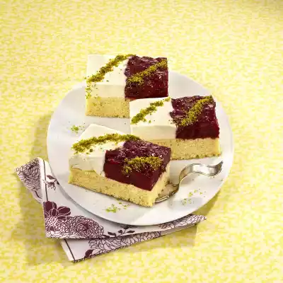 Whip cream until stiff. Mix mascarpone, lemon juice and sugar. Squeeze the gelatine, dissolve and stir into the mascarpone drop by drop. Carefully fold in the cream. Cover the base with a baking frame. Pour in the mascarpone and red fruit jelly in strips. Chill for at least 2 hours. Cut the cake into 18 pieces and sprinkle with pistachios