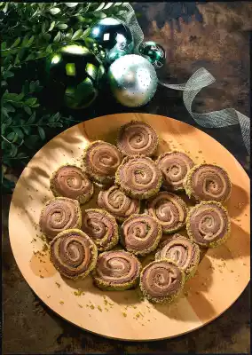Then brush with the remaining egg yolk. Mix remaining pistachios and sugar. Roll the roll in it. Cut into thin slices and place on a baking tray lined with baking paper. Bake in the preheated oven (electric cooker: 200 °C/ gas: level 3) for about 12 minutes.