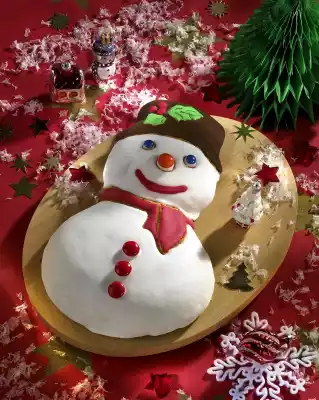 Grease snowman form (26 cm high). Fill in the dough and smooth it down. Bake in the preheated oven (electric cooker: 175 °C/ convection oven: 150 °C/ gas: level 2) for about 30 minutes. Take out baking tin. Let the cake rest in the form for 2 minutes. Turn out onto a cake rack and let cool. Mix icing sugar and egg white. Coat snowman with white icing. Divide the remaining icing into 3 portions. Colour with red and green food colouring or cocoa.
