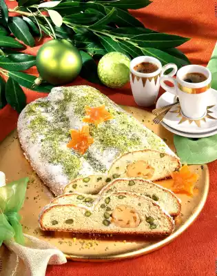 Repeat the brushing and dusting twice more. Finely chop the remaining pistachios and sprinkle over the stollen. Let the stollen cool down and decorate with orange stars. The Stollen tastes especially good if it can be left to stand for a few days in a good wrapper. Well packed and stored in a cool place it will keep for at least 14 days. Results in approx. 24 slices