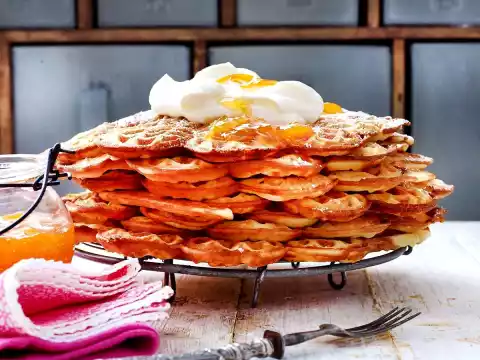 Dust the waffles with icing sugar. Add vanilla cream and orange marmalade (see below).
