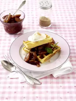 of dough in the middle of each waffle iron and bake until golden yellow. Bake another 5 waffles from the remaining dough in the same way. Halve the waffles as you like and arrange them on plates with some plum compote. Decorate with mint. Cinnamon cream tastes good with it