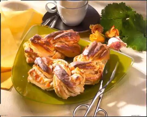 Turn 2 rolls around each other. Cut the braids into 5 pieces (approx. 12 cm). Spread them on 2 baking trays lined with baking paper and let them rise for another 10-15 minutes. Bake the trays one after the other in a preheated oven (electric cooker: 200 °C/ convection oven: 175 °C/ gas: level 3) for 20-25 minutes. After 5 minutes, turn the temperature down (electric oven: 175 °C/ convection oven: 150 °C/ gas: level 2). Mix the egg yolks and 1 teaspoon of water and brush the plaits with it about 5 minutes before the end of the baking time. Mix icing sugar and lemon juice and brush the finished, still hot plaits thinly with it. Let it cool down on a cake rack