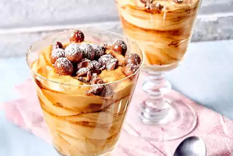 Carefully pour the mascarpone cream into four glasses (each containing approx. 200 ml) and sprinkle each with 1 tablespoon of chocolate-coated coffee beans. Dust with icing sugar.