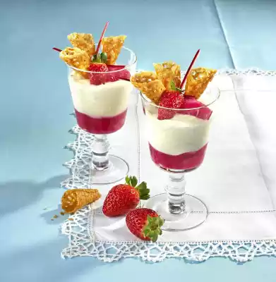 Put 1 strawberry aside for decoration. Clean the rest of the strawberries, quarter them and put them into the lukewarm rhubarb groats. Put 4 pieces of rhubarb from the groat aside for decoration. For the caramel croissants, melt 35 g butter. Stir in flour, 50 g sugar, grated coconut and honey. Chill the mixture for about 10 minutes. At large intervals, place 1/2 teaspoon of the mixture on a baking tray lined with baking paper. Approx. 8 pieces fit on a baking tray. Bake in the preheated oven (electric cooker: 175 °C/ convection oven: 150 °C/ gas: level 2) for about 5 minutes until golden brown. The mixture melts into circles. Allow to cool for 2-3 minutes, remove from baking parchment and turn into croissants around a pointed nozzle. If the croissants become too firm, you can put them back into the oven for a short time. Whip the cream until stiff and allow the vanilla sugar to trickle in.