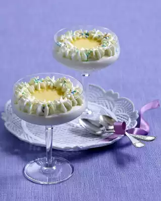 Spread the cream into flat, wide glasses. Spray the cream in tuffs in a ring shape onto the cream. Spread advocaat into the cream wreaths. Sprinkle cream with sugar pearls