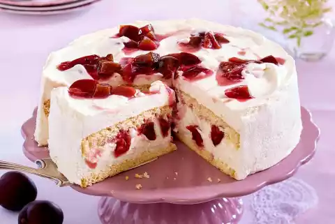 Cut the sponge in half crosswise. Place a cake ring around the lower cake base. Spread half the cream on the bottom. Put half of the compote in blobs on top and "swirl" it with a fork. Place the upper cake base on top, spread the rest of the cream and the rest of the compote on top. Chill for at least 4 hours.