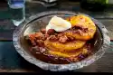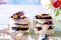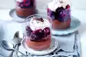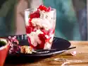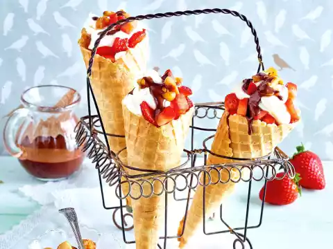 Fill the cream alternately with the strawberry cubes into the ice cream wafer bags. Break the nut brittle into pieces and sprinkle over them. Sprinkle with chocolate sauce.