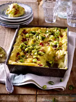 Drain the potatoes. Add sour cream, approx. 1/2 cheddar and milk and mash to puree. Season to taste with salt, pepper and nutmeg and place in a greased casserole dish. Spread the bacon, rest of the cheddar, parmesan and butter in flakes over it and bake in a preheated oven (electric cooker: 200 °C/ convection oven: 175 °C/ gas: see