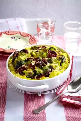 Mix broccoli, cabanossi and béchamel sauce and spread on the mashed potatoes. Sprinkle with 50 g cheese and hazelnuts. Bake in a preheated oven (electric cooker: 200 °C/ convection oven: 175 °C/ gas: see manufacturer) for approx. 30 minutes. Take out and serve immediately