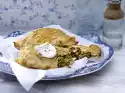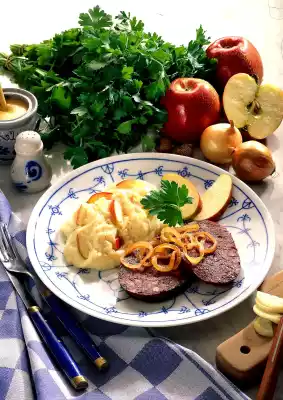 Drain and mash the potatoes or press them through a potato ricer. Warm milk and stir in. Season the mashed potatoes with salt, pepper and nutmeg and fold in the apple pieces. Arrange mashed potatoes, black pudding and onion rings on plates and serve garnished with parsley and apple slices.
