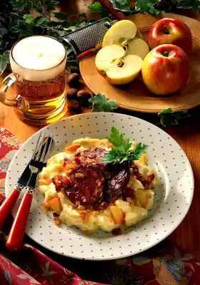 Arrange slices of sausage, mashed potatoes and onion-bacon vegetables on plates. Garnish with parsley and sprinkle some nutmeg over the puree.
