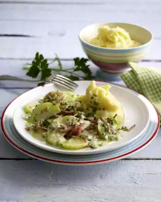 Boil 750 ml water, add 1 teaspoon of salt. Remove from heat, add milk. Stir in the purée flakes. Wash parsley, shake dry and chop. Add cream to the kohlrabi, bring to the boil, stir in parsley and ham.