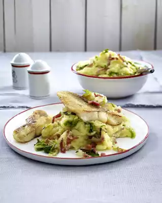 Drain the potatoes and let them evaporate briefly. Mash with milk to a puree. Fold in the bacon mixture. Season with salt and nutmeg. Drain fish on kitchen paper. Serve with the mashed potatoes