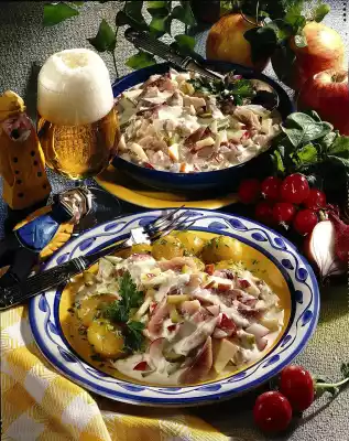 Peel and chop the onions. Mix with mayonnaise, yoghurt, horseradish and 3-4 tbsp. cucumber stock. Season with pepper. Mix with the salad ingredients and leave to stand for at least 1 hour. Season to taste again