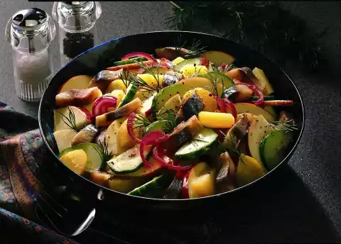 Boil up vinegar and onions. Season with salt, pepper and sugar. Add oil. Pour over the salad. Cover and leave to stand for about 30 minutes. Season to taste again before serving. Black bread tastes good with it