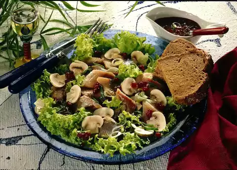 Wash the matie fillets (water depending on salt content) and dab dry. Cut the fillets into pieces. Clean, wash and drain the salad and pluck into bite-sized pieces. Clean mushrooms, cut into slices and arrange on plates.