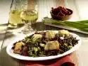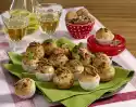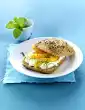 Arrange apple rings, matie and onions on top. Sprinkle with dill and pink berries. Place the upper half of the roll on top. Garnish with dill.