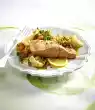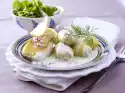 Peel onions and cut them into rings. Drain the potatoes, quench and possibly peel off the skin. Rinse and dab the maties. Serve with dip and onions. Garnish with lemon, lime, herbs and possibly dill flowers