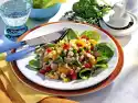 Mix all salad ingredients in a bowl. For the sauce, peel and finely dice onions. Mix mayonnaise, sour cream, onions, horseradish and four tablespoons of cucumber water. Season to taste with a little salt and mix into the salad ingredients. Leave to stand for at least an hour. Wash the potatoes and cook in boiling water for 20 minutes. Wash chives, dab dry and cut into small rolls. Pour potatoes onto a sieve, rinse with cold water and peel. Heat the fat in a saucepan, toss the potatoes and chives in it.