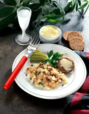 Wash the maties, dab dry and dice finely. Peel and finely chop the onion. Drain capers. Mix the maties, capers and onions and arrange on plates. Garnish with parsley and gherkins.