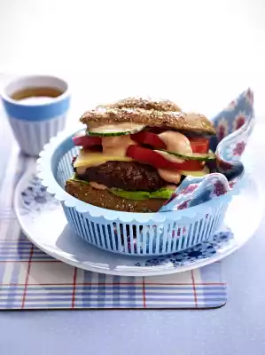 In the meantime cut open the rolls. Spread a thin layer of ketchup mayonnaise on the cut surfaces. Cover the undersides with lettuce, meatballs, cheese, tomatoes and cucumbers, spreading the remaining ketchup mayonnaise in between.
